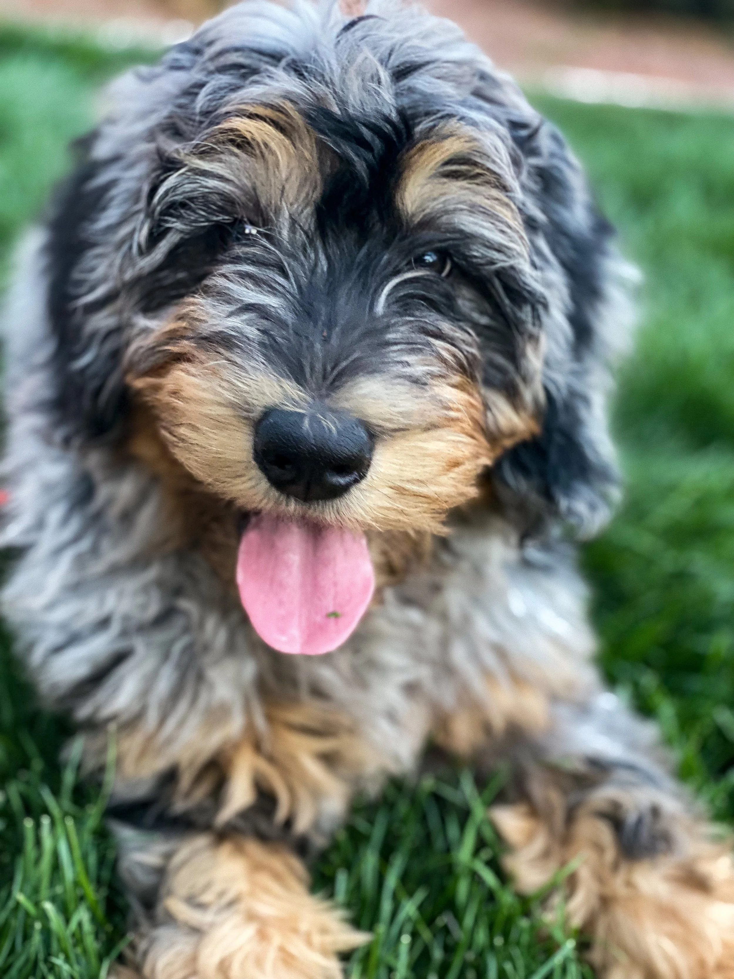 Juni is a complete lovable teddy bear of a dog. She is an F1 standard tricolor/merle Bernedoodle (75lbs).